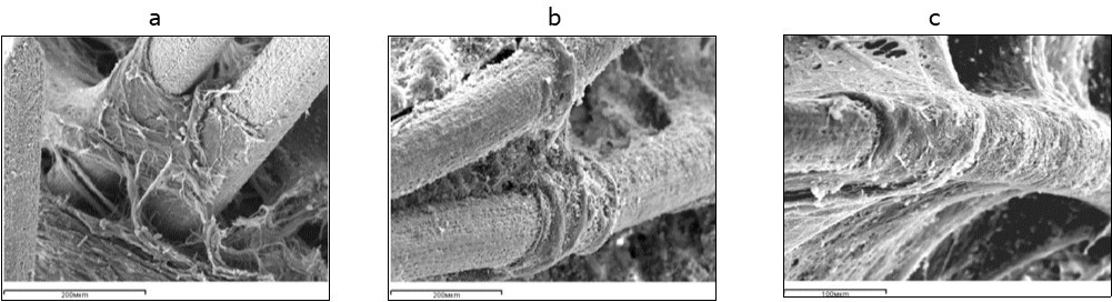 A thin membrane-like cover of connective tissue was formed round the implant threads and cells in the defect periosteal zone in the experimental group animals 7, 14 days after surgery (Figure 1a). The cover formation began on the surface of the thread in the places of its weavings and spread from the periphery of the cells to their center. The cover had a layered structure. The inner layer consisted of dense formalized connective tissue. Collagen fibers were collected into dense circularly oriented lace-like bundles, and they braided the implant threads in the form of a sleeve, they were firmly fixed to their microporous surface, grew into the gaps between them and provided the fixation of the implant threads both between each other and in the bone defect (Figure 1b). The outer layer of the cover was formed with dense non-formalized connective tissue the thin flat wavy twisted collagen-fiber bundles of which located as a fine-cellular network between the lace-like bundles of the inner layer framework and connected with surrounding bone and connective-tissue structures (Figure 1c). The areas of active appositional bone formation were observed below the connective-tissue cover in the endosteal and central zone of the defect and at its edges round the implant structures, as well as on their surface. A layer of reticulofibrous bone tissue of 300-400 µm thickness emerged on the implant thread surface directly forming osteointegration connection (Figure 2a). The implant threads in the osteointegration areas were coated with mineralizing bone matrix. Newly formed trabeculae grew into the implant fine-cellular structure (Figure 2b,Figure 2c). The results of quantitative studies (Table 1) evidenced of reparative osteogenesis significant activation, as well as of increasing the maturity degree of newly formed bone tissue in the regenerated bones of the animals of the experimental group comparing with those in the control group. Thus, bone tissue volumetric density in the defect was 144.19%, index of compactness – 155.56 % in comparison with the values in the animals of the control group (p < 0.001).