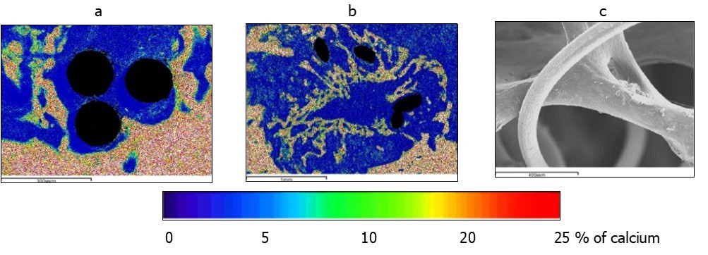 Figure 3.The metaphyseal defect filling 30 days after surgery in the control (а) and experimental (b, c) group of animals, a, b – charts of x-ray electron probe microanalysis, images in calcium characteristic x-ray emission, magnification × 20; c – scanning electron microscopy, magnification × 500